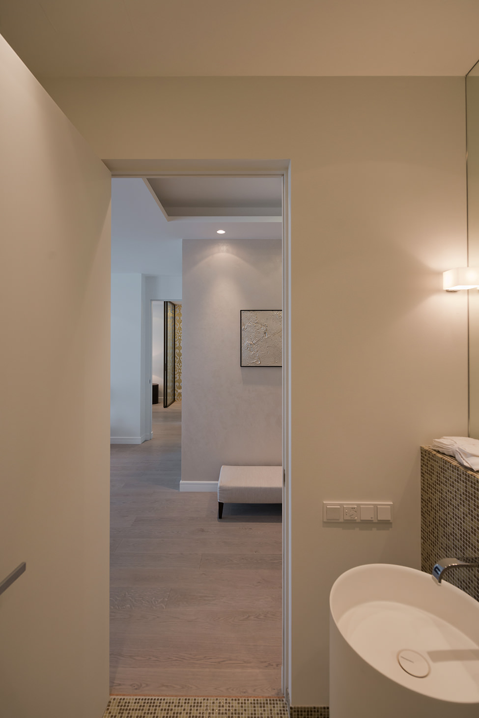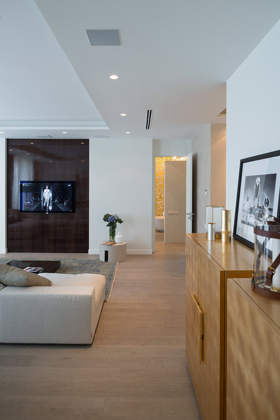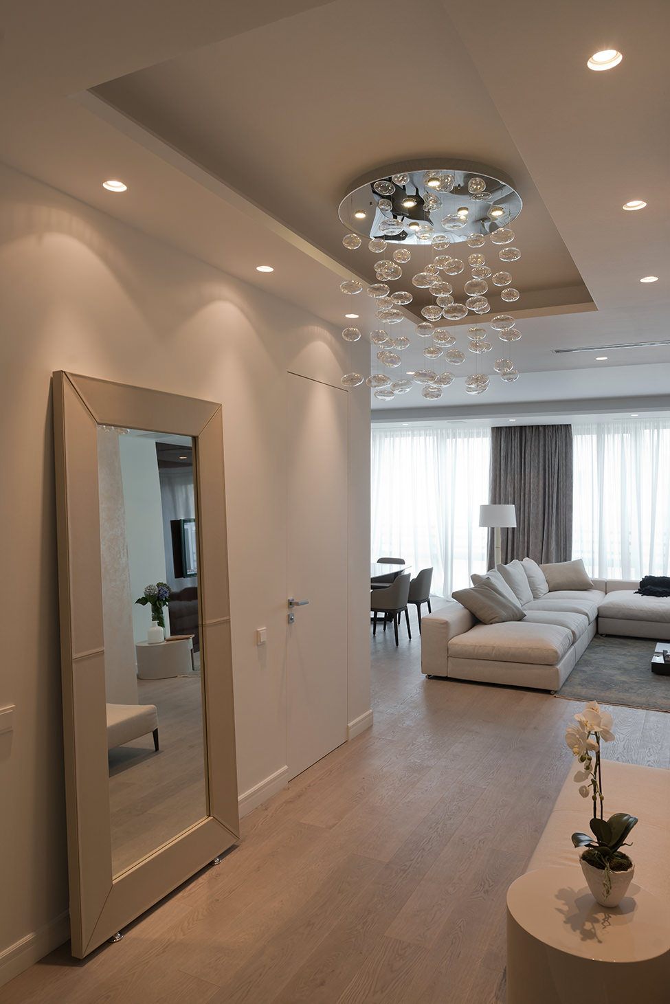 Desi apartamentul are o abordare minimalista, cu detalii elegante, nimic nu este la pus la intamplare. Fiecare loc, obiect sau accesoriu a fost bine gandit si aranjat. Intreg apartamentul are susrse de iluminat artificial la fel de elegante si pretentioase precum intregul sau aspect. De exemplu holul de la intrare are un candelabru din sticla sub forma de balon. Celelalte camere sunt luminate discret, cu lumini care parca curg din tavan. Totul este perfect in combinatie si cu paleta de culori foarte calda folosita.