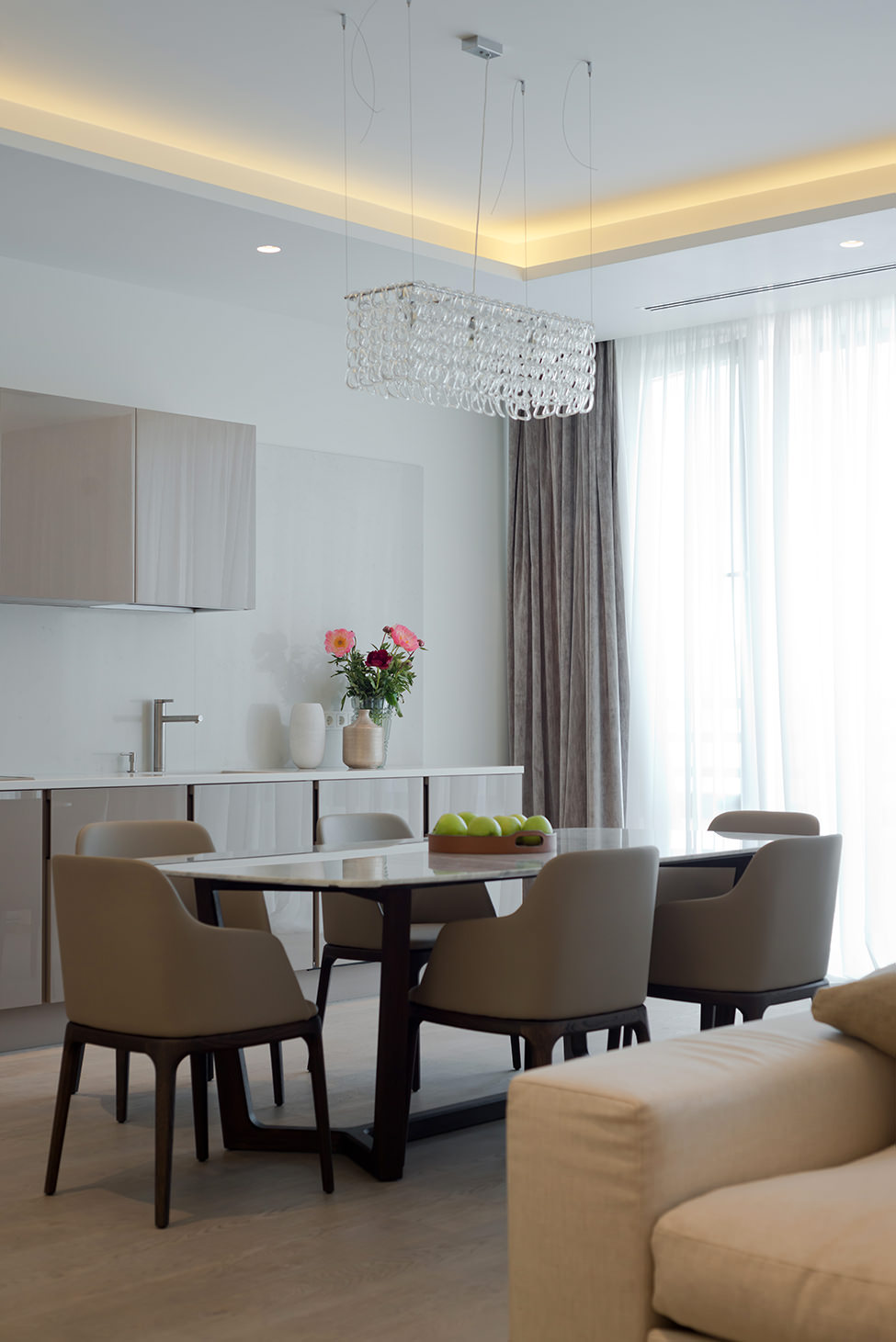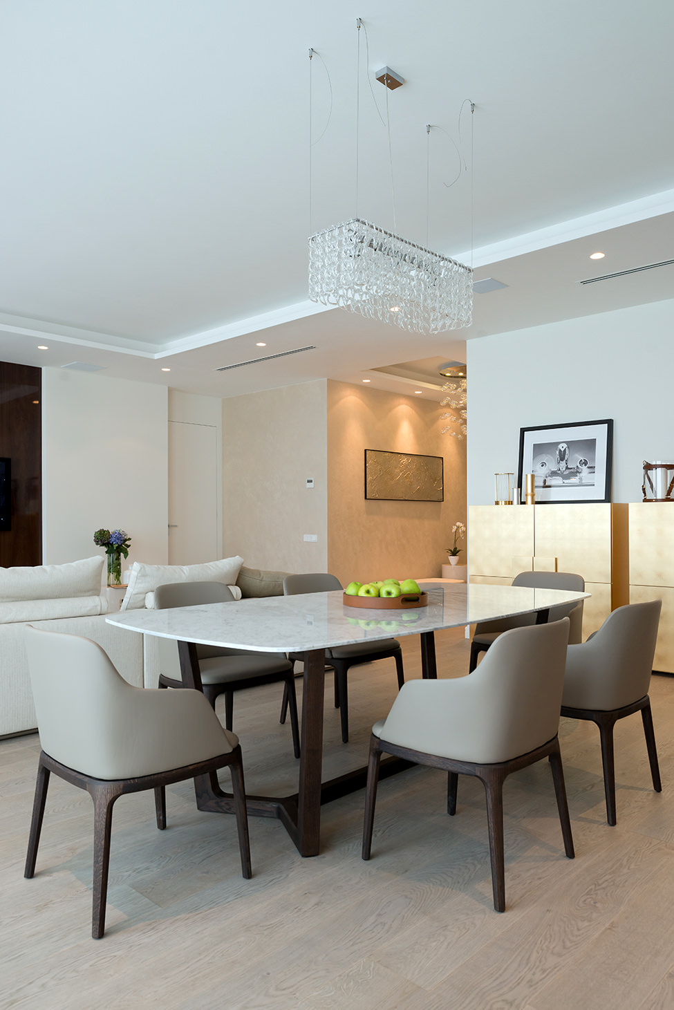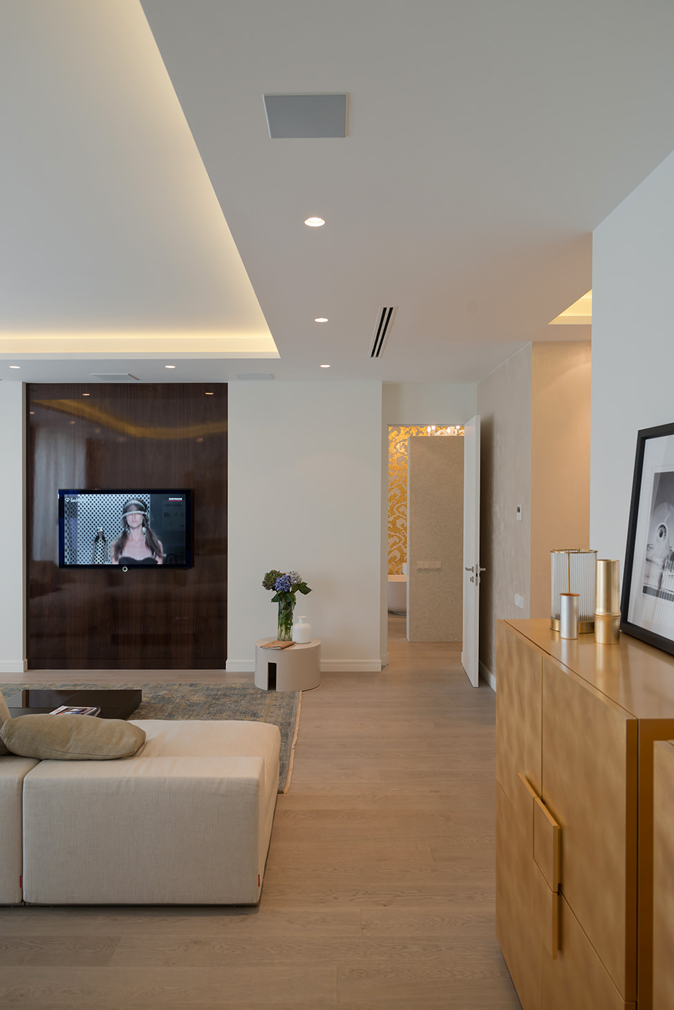 Desi apartamentul are o abordare minimalista, cu detalii elegante, nimic nu este la pus la intamplare. Fiecare loc, obiect sau accesoriu a fost bine gandit si aranjat. Intreg apartamentul are susrse de iluminat artificial la fel de elegante si pretentioase precum intregul sau aspect. De exemplu holul de la intrare are un candelabru din sticla sub forma de balon. Celelalte camere sunt luminate discret, cu lumini care parca curg din tavan. Totul este perfect in combinatie si cu paleta de culori foarte calda folosita.