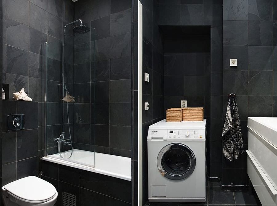 Baia principala este spectaculoasa. S-a folosit gresie si faianta neagra cu obiecte sanitare albe. Este clasicul care scoate eleganta in evidenta si continua seriozitatea din intregul apartament.