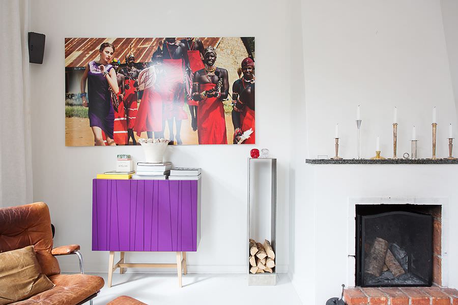 Pentru elementele de decor s-au folosit in general culori reci si neutre. Dar in sufragerie s-a adaugat o pata de culoare prin inserarea unor piese de mobilier mov si un tablou cu foarte mult rosu. Prin intermediul acestora s-a adaugat un strop de viata camerei si o eleganta desavarsita.