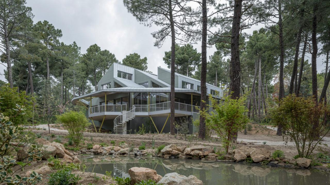 În interior, insula de bucătărie din oțel inoxidabil este piesa centrală a spațiului de zi, orchestrând fluxul dintre living, sala de mese și terasa exterioară. Pardoseala din terrazzo și plăcile din ceramică verde-smarald completează paleta cromatică a marmurii exterioare.