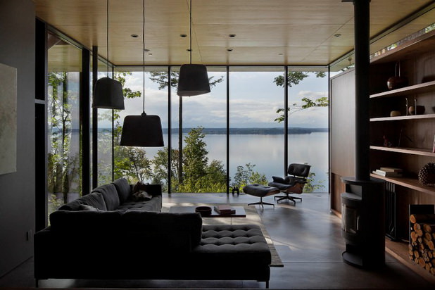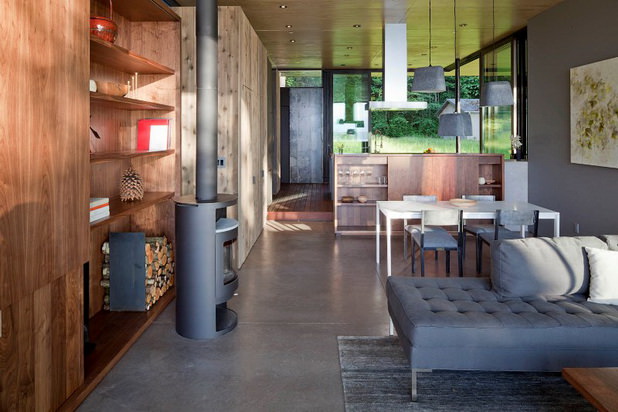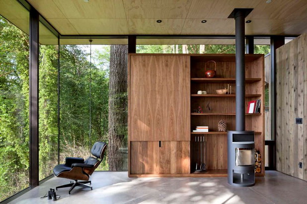 Chiar daca in casa nu se gaseste prea multa mobila, cea existenta este de bun gust, moderna, bine asezata in contextul general. Instalatiile de incalzire sunt la randu-le interesante, facandu-se cu lemn pe post de combustibil. In fond, in conditiile in care casa e inconjurata de padure si pe marginea lacului, incalzirea cu lemne e cea mai potrivita, chiar daca ea nu mai este prea practicata in casele moderne actuale.