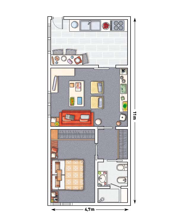 Asa ca astazi va aratam un proiect indraznet al unui cuplu caruia ii plac ideile si provocarile in materie de design. Asa ca ei s-au gandit sa isi renoveze subsolul casei, sa mai creeze un spatiu util cu adevarat. Pentru ca au stiut ca in astfel de situatii este nevoie de parerea si experienta unui specialist au angajat o firma de design. Spre surprinderea si multumirea lor rezultatul final a fost spectaculos. Spatiul intunecat si umed de sub casa a devenit un apartament cu 2 camere, aerisit, colorat si foarte bun pentru a locui.