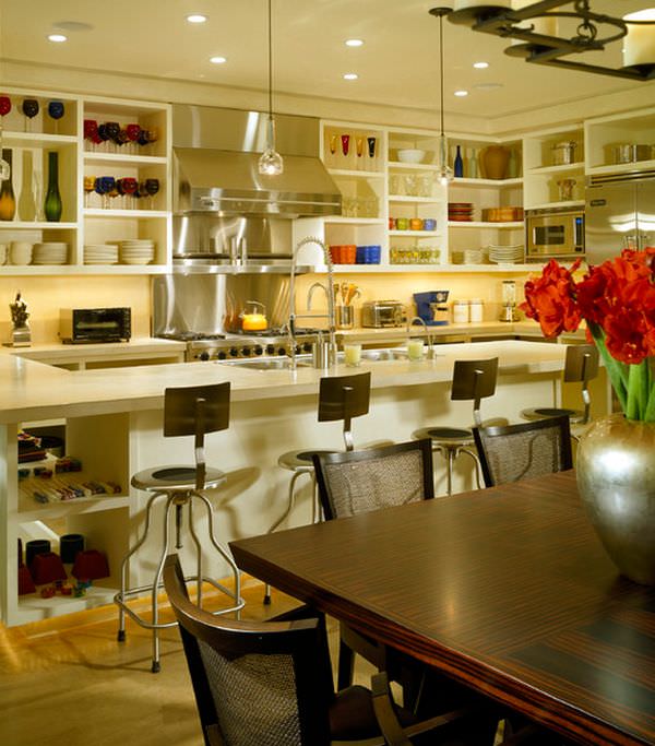 3) Dulapuri fara usi. Prin natura ei, bucataria are multe dulapuri si dulapioare. Ce ar fi daca ati renunta la usi si ati lasa sa se vada farfuriile si oalele? Sigur, nu toata lumea va fi de acord, insa este o metoda foarte buna de a salva spatiu.
