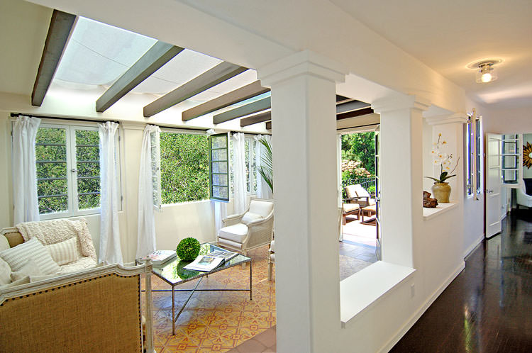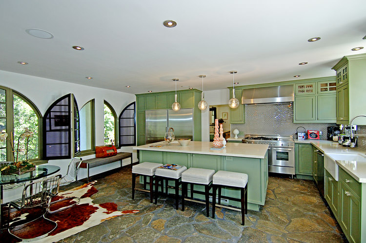 Spatiul destinat livingului are tavane inalte, cu grinzi din lemn masiv si foarte multe ferestre cu o forma arcuita. Bucataria a fost decorata cu mobilier verde, ca o uniune cu natura, cu o pardoseala din piatra naturala si ferestrele mari se intalnesc chiar si in acest spatiu.