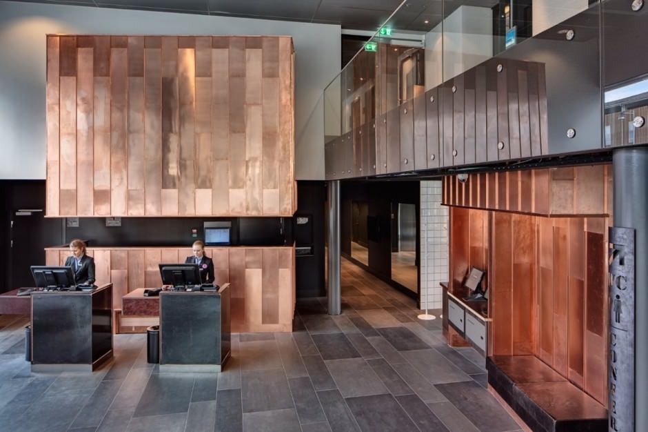 In timp ce cele mai multe hoteluri moderne sunt imbracate in piatra, lemn si sticla in mare parte, Radisson Blu merge intr-o directie cu totul diferita prin combinarea lemnului, fierului si cuprului. S-au folosit nuante de cupru in lampile suspendate si tevile de metal expuse pentru a conferi acea imagine de vechi-modern.