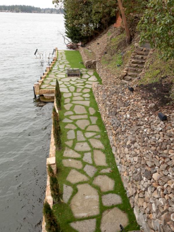 Acolo unde proprietatile sunt abrupte, construirea unui ponton pavat cu piatra si a unei cai de acces poate reprezenta solutia optima. Desi o astfel de amenajare s-ar putea sa fie dificila si sa coste un pic, avantajele sunt in mod clar in favoarea acestei metode. In fond, un ponton mai larg poate fi folosit si pentru relaxare, dar si pentru luat masa sau chiar si pentru lucru in liniste.