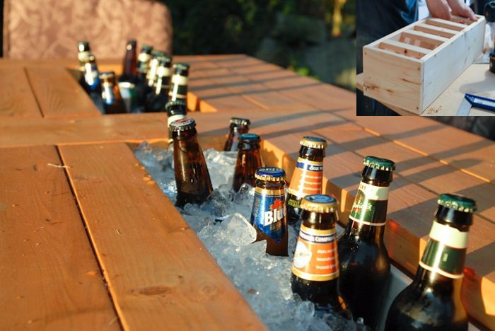 Masa de exterior cu racitor de bauturi incorporat – aceasta este, cu adevarat, o idee foarte buna si interesanta. Nu va mai fi nevoie sa va plimbati din casa afara si invers pentru a aduce bauturi reci de la frigider, atunci cand faceti un gratar cu prietenii. Construiti o masa de lemn normala, cu scanduri, in care lasati un spatiu astfel incat sa va incapa doua ghivece din acelea lungi, dreptunghiulare pentru flori. Dupa ce le-ati atasat, construiti un support, tot din lemn, care sa va permita sa scoateti ghivecele in caz ca trebuie schimbate (vezi foto mica), Dupa ce ati terminat, umpleti cu gheata, aduceti sticlele si chemati-va prietenii!