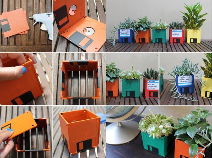 Va mai amintiti de dischetele despre care va vorbeam la inceputul articolului? Ei bine, daca inca mai aveti asa ceva acasa, le puteti transorma cu success in niste ghivece cu design unic. Pentru un ghiveci veti utiliza patru dischete. Va mai trebuie doar solutie de lipit rezistenta si pamantul in care ati plantat florile. Etichetele dischetelor sunt un plus, pentru ca, in acest fel, puteti trimite cuiva drag o floare, cu mesajul scris chiar pe ghiveci. De asemenea, tot pe eticheta va puteti nota si denumirile plantelor. Ingenios, nu-I asa?